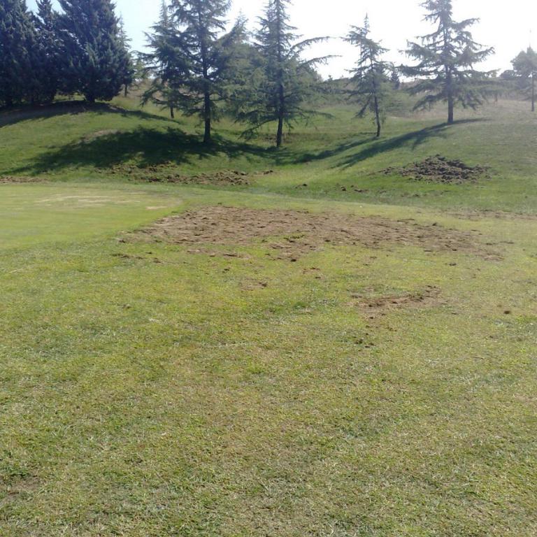 Ersteres ist ein zunehmendes Problem in Katalonien. Die Wildschweine nehmen zu und verwüsten viele Golfplätze hier. Pflanzt man die herausgewühlten Rasenstücke wieder ein, wächst das Gras nur bei genügend Wasser wieder an. Auch in Katalonien gibt es strenge Einschränkungen für das Bejagen der Wildschweinbestände. Wirklich schützende Zäune um einen Golfplatz zu bauen ist sehr kostenintensiv und oftmals behördlich auch nicht erlaubt.